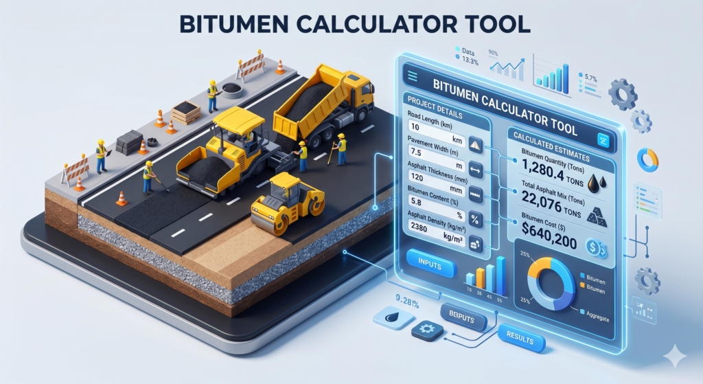 A bitumen calculator is a digital tool — usually a web-based app or spreadsheet — that estimates how much bitumen you need for a given surface area, depth, and mix type. You punch in a few numbers, and it spits out the quantity in liters, kilograms, or tonnes.